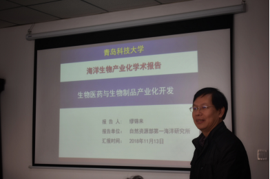 报告会上,缪锦来研究员介绍了关于南极冰藻DNA光修复酶、海藻胶植物软胶囊、海带膳食纤维素以及海藻硒多糖等海洋生物医药及活性物质相关研究成果。